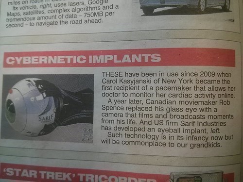 Sarif Industries, the "US firm" mentioned in this recent edition of the British tabloid, is actually a fictional company in the video game Deus Ex: Human Revolution. The image is also from the video game.