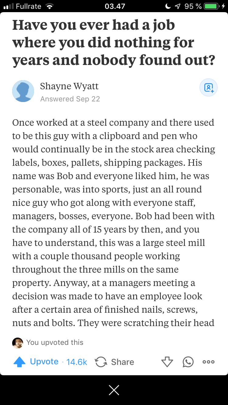 The power of a clipboard, ladies and gents. The question on Quora, "Have you ever had a job where you did nothing for years and nobody found out?" brought out a story of a man named Bob, told by user Shayne Wyatt.