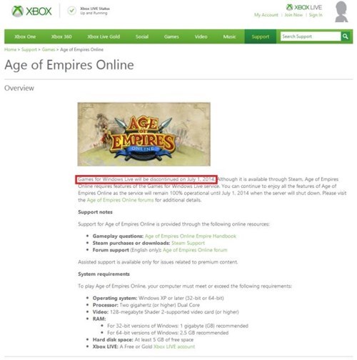 According to an Age of Empires support page, Games for Windows Live will cease to exist on July 1, 2014. IGN reached out to Microsoft for a statement and got this vague response: