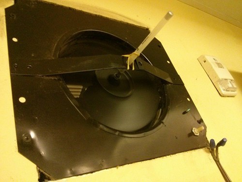 Submitter Jax describes this fix: The bearings in this fan failed months ago. I kept it running by coating the shaft and bearings with oil as the fan spun. Today the bearings finally failed and the shaft kept popping out of the bearing sleeve, so I took the ink out of a pen, pressed it against the shaft, and put a rubber band against it to hold it in: a 100 dollar motor temporarily repaired with a 50 cent pen.