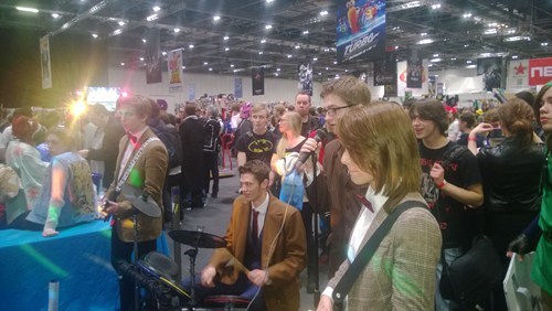 Over the weekend at the London Comic-Con four Who cosplayers decided to give the Rock Band section a bit of a go; tis a shame Doctorin' the Tardis isn't on there.