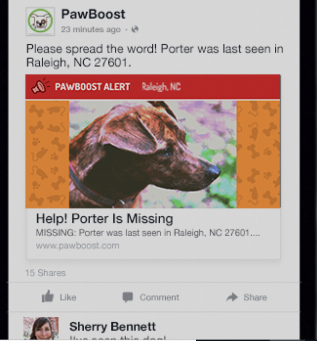 When someone loses a pet, all they have to do is report the pet missing on PawBoost Facebook page for their area; this will trigger notifications to all PawBoost email subscribers and app users local to the lost pet.