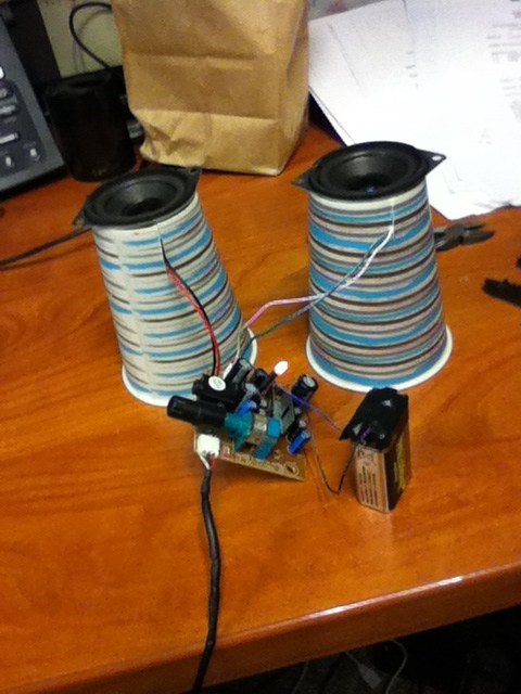 The transformer in submitter onecardshortof52's Logitech speakers was humming, but they couldn't be fixed without destroying the shell. So, after taking them apart, splicing some wires, replacing the power source, and giving them some stylish new resonance chambers (paper coffee cups), onecard now has a functioning set of desktop speakers.