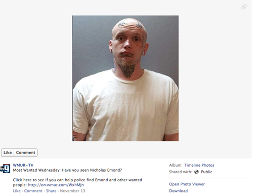 Nicholas Emond is a man on the run and has a lot to say about it. There is currently an outstanding warrant for his arrest related to violations to the conditions of a monitored release that followed felony charges of illegal firearms possession. Because police consider him to be ARMED and DANGEROUS, a local ABC affiliate posted his photo on their Facebook most wanted list.