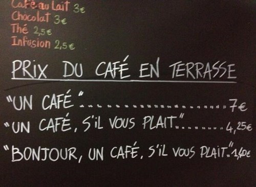 "One coffee" .................... 7 euros.Just goes to show you: a little courtesy goes a long way.
