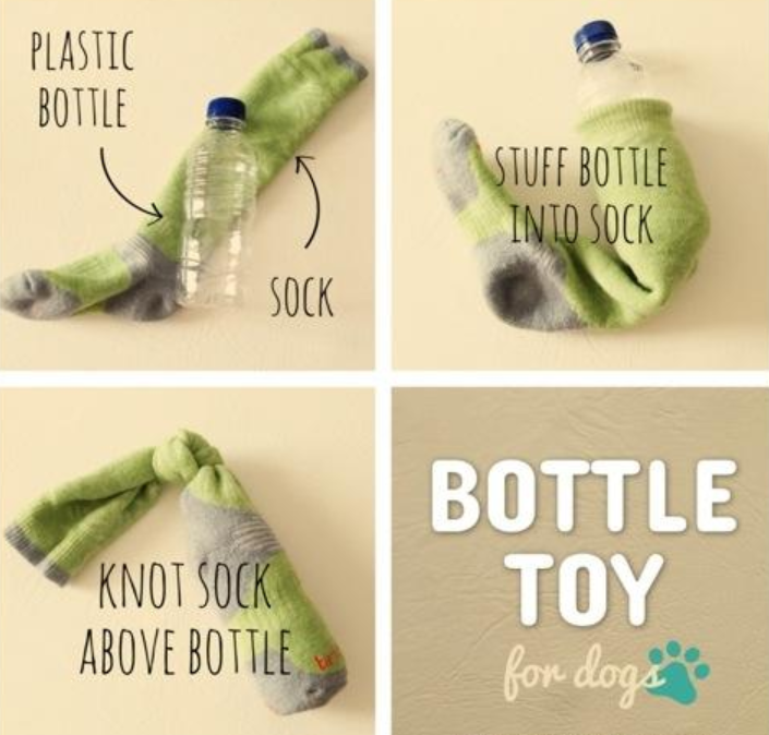 Take a long sock that has lost its mate or is old, put a bottle inside it, tie, and presto, instant dog toy.