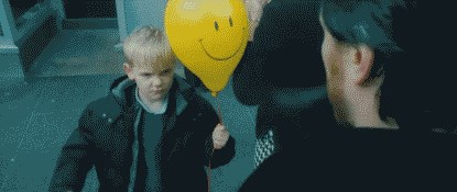 of a kid holding a yellow balloon that gives a man the middle finger, the man takes away the balloon and releases it into the air, returning 2 middle fingers to the kid. Clearly he wants children one day.