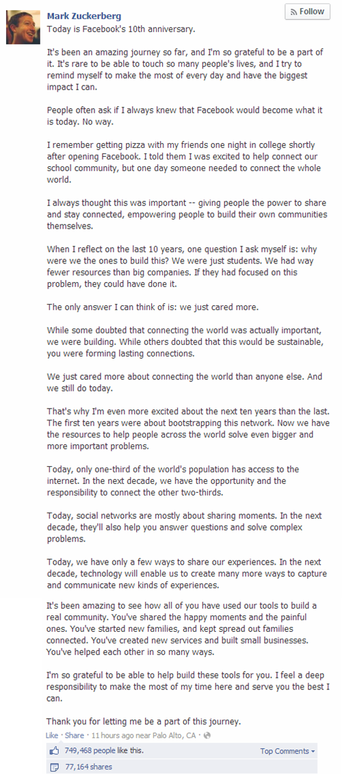 In Honor of the 10th Anniversary of Facebook, a Word from Zuckerberg and a Compilation of the Most Beautiful Person on Facebook