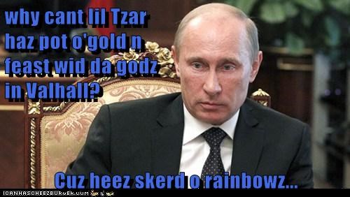 why cant lil Tzar haz pot o'gold n feast wid da godz in Valhall? Cuz heez skerd o rainbowz...