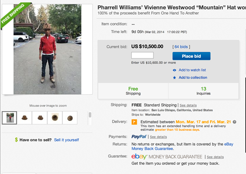 The current bid is $10,500 and all proceeds benefit From One Hand To Another, which was established by Pharrell to provide educational opportunities to children.