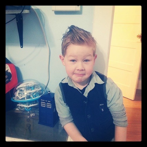 So every day my son tells me whos hair he wants. Usually it's the 10th or 11th doctors, sometimes Captain America's. Today he threw me for a loop and asked for Rory hair like in Dinos on a Spaceship. This is his first slicked back hairdo. He dressed himself and said "Today I'm Rory the Rock Star".