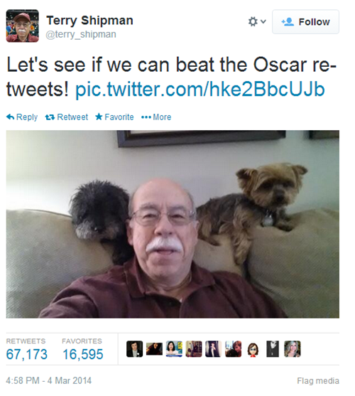 Terry was just an ordinary guy with a dozen followers when he decided to get a retweet train rolling based on Ellen's famous Oscars celebrity picture. Overnight he's gained more than two thousand followers and the train is still rolling. So hey, if you feel like challenging the celebrity Twittersphere, give it a retweet!