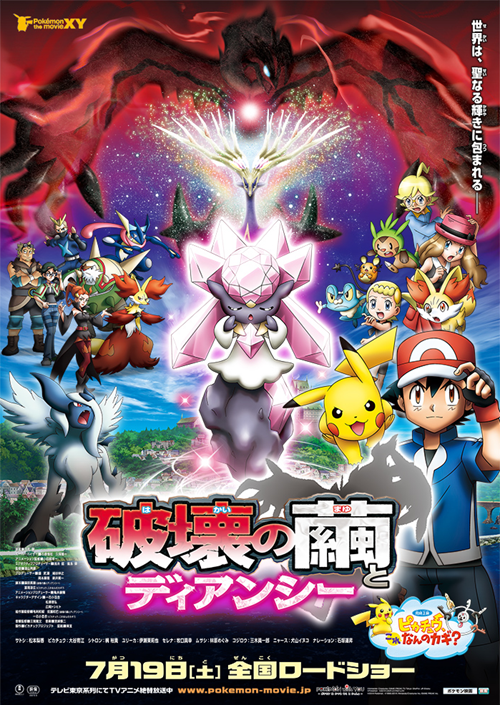 Movie storyline: Diancie is the princess of the Country of Diamond Ore, which is the stage for this year's movie. The Country of Diamond Ore is a beautiful underground country, where many Jewel Pokémon Carbink live peacefully. And in the country is a huge diamond known as the Holy Diamond... The Holy Diamond is an important energy source that maintains the Ore Country, and has fulfilled this role for a long time. The Holy Diamond was created by Princess Diancie alone. However, she no longer has the power she once had. And... the time is near. The life of the Holy Diamond is almost exhausted. The beautiful Ore Country will be destroyed! But then, Diancie meets with Ash and Pikachu, and decides to leave on a journey to seek the holy powers of the Life Pokémon, Xerneas, in order to save her country. But on the way, the female thief Marilyn, the ninja thief Riot, and Team Rocket all attack them, seeking Diancie's power. With help from the parent-and-child Millis and Argus, the group manages to make it out of danger and continue their journey, but then they find the cocoon of the sleeping Destruction Pokémon Yveltal, which once annihilated all life in Kalos, blocking their way---