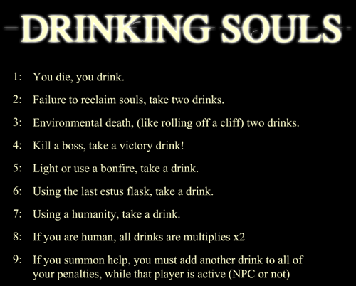 The premise is simple: answer a series of questions related to your Dark Souls experience and receive a custom-tailored drinking game. Are you playing with friends? Are you prone to rage quitting? There's a sip to be had for that. Get yours by clicking here or on the image above.