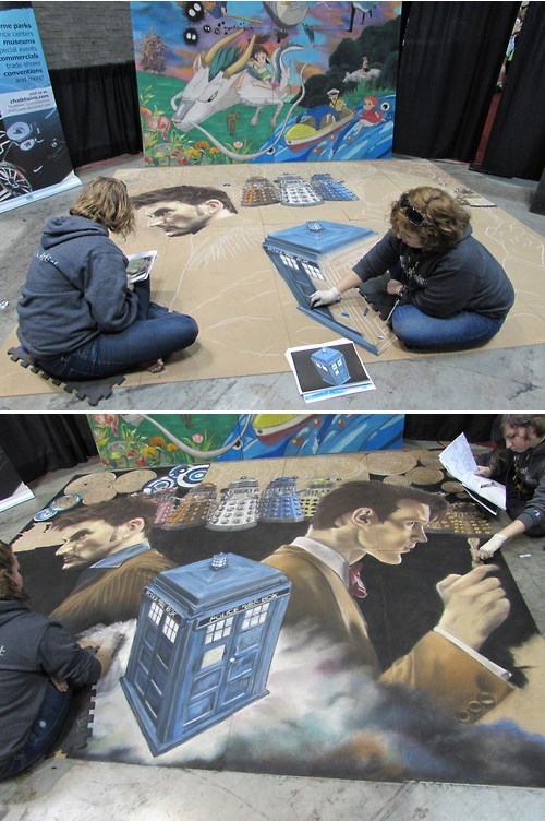 The Chalk Sisters, travel from convention to convention and crate murals from chalk that are auctioned off as the make them. At MegaCon 2014 they designed this fantastic Doctor Who mural.