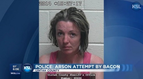 Yep, that was an attempted arson by burning bacon, perpetrated by a woman with the last name Crispi. Check it out: