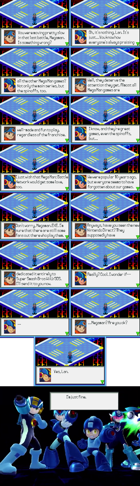 He may not be completely playable, but I'm happy with him in the Final Smash. I'd be happy if Megaman.EXE was just a trophy.