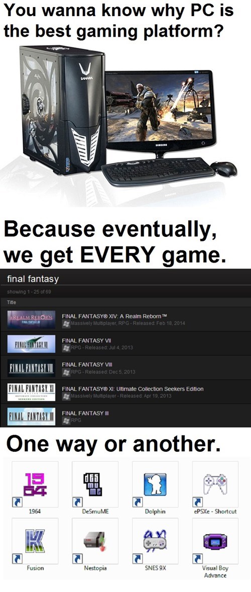 Console gamers can parrot "GTA V" all they want, but PS4 and Xbox One emulators are already in the works. The only difference between whether or not Rockstar puts it on PC themselves is if they get ANY money for it.