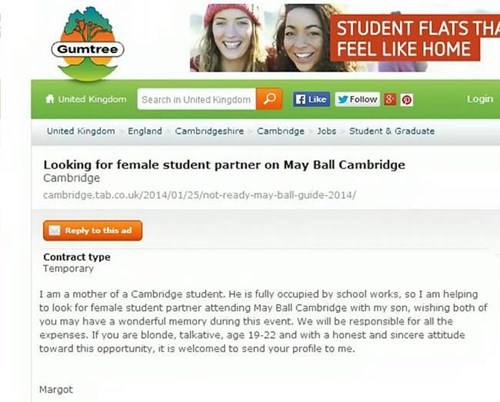 The post, placed under 'Jobs' in the Cambridge area, states she is 'looking for a female student partner on May Ball Cambridge'.