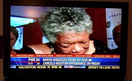 Maya Angelou had previously canceled a luncheon in Houston earlier in the week for health reasons, though the way this station phrases it she had seemingly decided to cancel after her own passing. Smooth move!