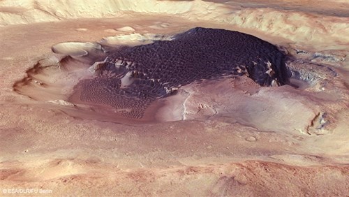 Rabe formed in an instant when a large rock slammed into the surface of Mars long ago. It may have started as a normal, if large, impact crater, but things change. The cause of the flat floor isn't well known, but likely due to volcanic deposits filling it, plus material blown in over time.