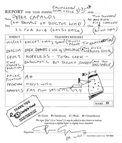 To benefit Cecily's Fund, Peter Capaldi wrote a report card for Doctor Who to go on Ebay. It looks like his manners aren't up to snuff.