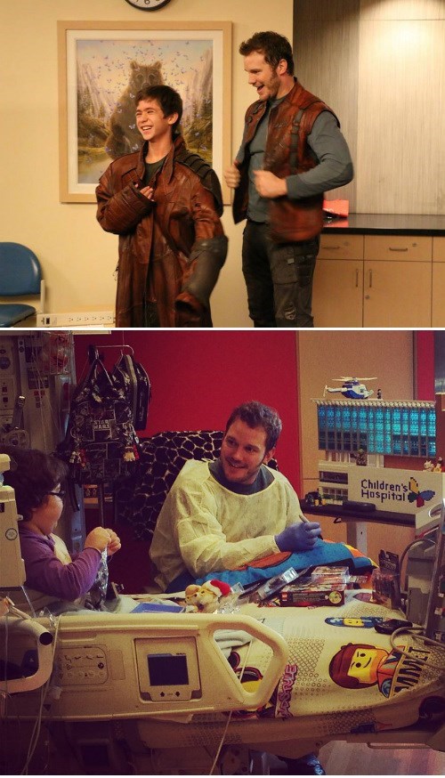 Most celebrities take props and costumes from the sets of their movies as mementos, not Chris Pratt. This Guardian of the Galaxy took his full Star-Lord costume just so he could wear it to children's hospitals. This week he stopped by Children's Hospital Los Angeles to let the kids try on the jacket and talk superheroes.