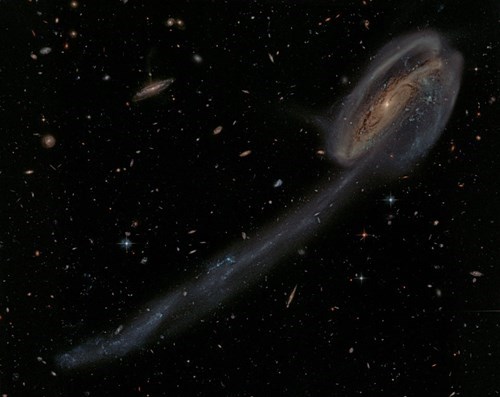 Why does this galaxy have such a long tail? In this stunning vista, based on image data from the Hubble Legacy Archive, distant galaxies form a dramatic backdrop for disrupted spiral galaxy Arp 188, the Tadpole Galaxy. The cosmic tadpole is a mere 420 million light-years distant toward the northern constellation Draco. Its eye-catching tail is about 280 thousand light-years long and features massive, bright blue star clusters. One story goes that a more compact intruder galaxy crossed in front of Arp 188 - from right to left in this view - and was slung around behind the Tadpole by their gravitational attraction. During the close encounter, tidal forces drew out the spiral galaxy's stars, gas, and dust forming the spectacular tail.