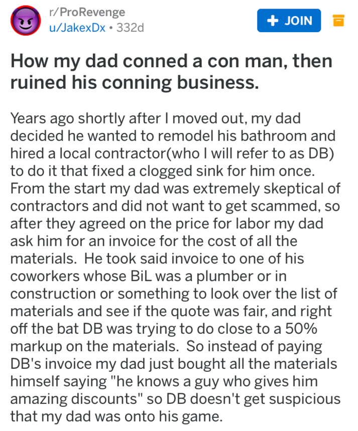 Yeah take that con man contractors! This dad's beautifully executed revenge tale is an inspiration to anyone who's ever been screwed over by sketchy contractor companies, looking to exploit good paying people's requests.