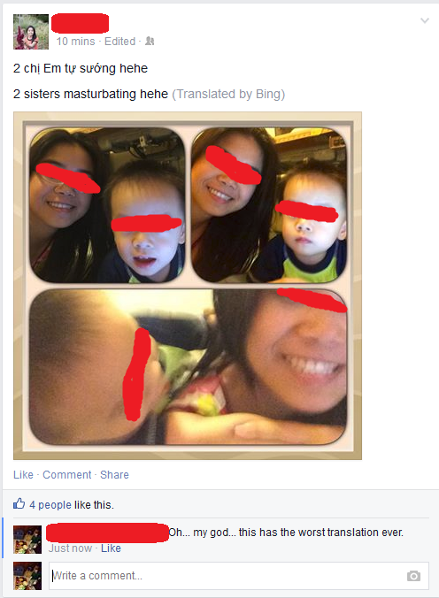 The translation was supposed to be "2 sisters taking selfies" but apparently the word used for "taking selfies" is the same for "masturbating." It must make certain conversations awkward in Vietnam...