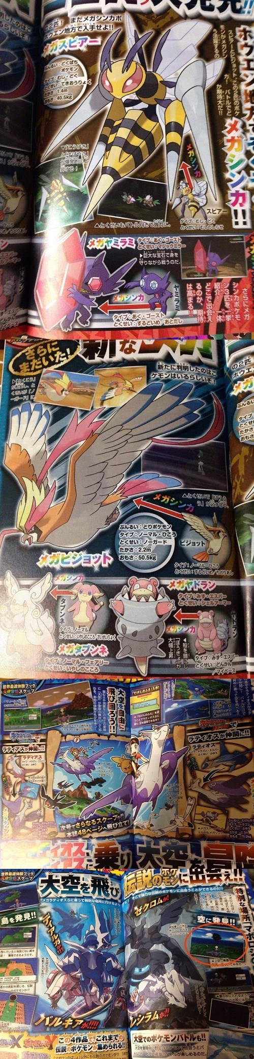 Mega Pidgeot is Normal/Flying-type with the ability No Guard and Mega Beedrill is Bug/Poison-type with the ability Adaptability. You can fly on Mega Latios & Latias in the overworld and find Pokémon such as Reshiram, Zekrom, Dialga & Palkia in the sky. Latios is exclusive to Omega Ruby and Latias is exclusive to Alpha Sapphire.