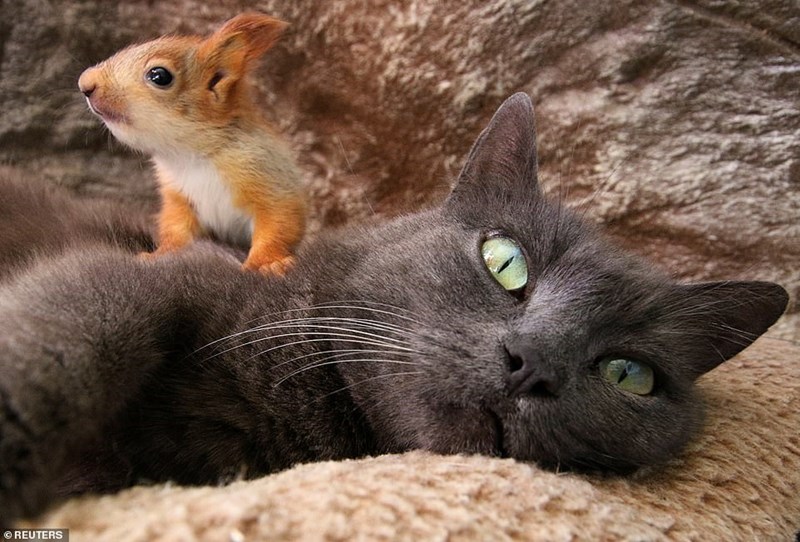 Pusha, who lives in a miniature park on the southern Crimean peninsula, was given the baby squirrels by local residents who saw the animals needed a mom.