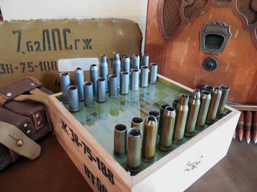 Sunset's Workshop says: I've been looking at this site for years, first time submitting something and that something happens to be my own work. I've seen plenty of geekery and items that I loved shown to me first here, so I figure it's about time to do the same. I understand that it's not for everyone, but chess is the 'universal' game that most 'geeks' can relate to. In that mindset, and being a person that loves both chess and trench art, I've made a combination of the two with a chess set using spent 7.62x54r shell casings for pieces. This isn't the only set i've made, and there are -plenty- of pictures avalible. I don't know I'm more just tossing my hat into the ring and seeing where it lands.