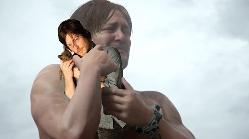 Norman Reedus crying while holding Norman Reedus holding a cat.
