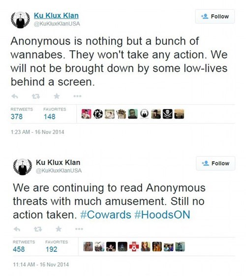 As of the morning November 16, the Ku Klux Klan still had control over their own tweets, as you're seeing from their official Twitter feed here (who knew that abject hate could be so tuned in to social media trends?). Just later that evening Anonymous seized the Twitter account to use to their own ends, changing its profile picture to their own iconic image and tweeting things like this: