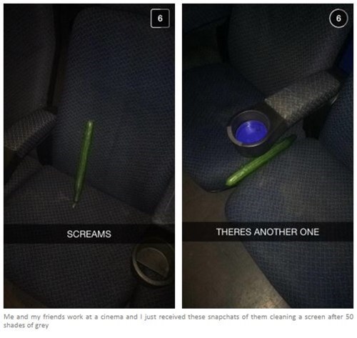 The text under the images reads: "Me and my friends work at a cinema and I just received these snapchats of them cleaning a screen after 50 shades of grey." Ladies please, don't forget your cucumbers.