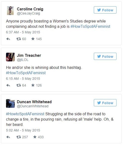 Conservative talk show host Doc Thompson started the hashtag #HowToSpotAFeminist as a smug commentary on women's issues - and sure enough he received all number of responses snidely criticising their claims to be a part of the movement. It didn't take long, however, for others to jump in and hijack the hashtag with their own feminist commentary. Here's some of our favorites below:![]()