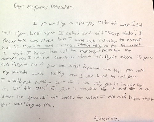 According to the police department in Savannah, Ga, where the call was made, the boy's parents brought him to the local 911 center where this letter was read aloud to the staff. While he was visiting he got to see how the 911 center works and understand why prank calls interfere with important emergency operations.