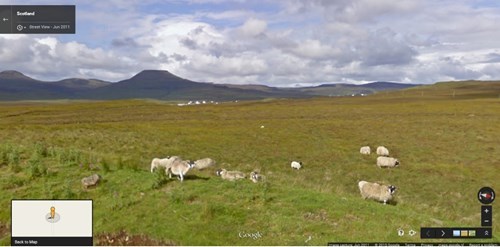 Most people are familiar with the street view feature of Google Maps and the self-driving cars that collect the images. Ladies and Gentlemen, thanks to this feature and an enterprising Tumblr blog, I now present to you Google Sheep View, a collection of sheep in their pastures as seen from Google Maps.