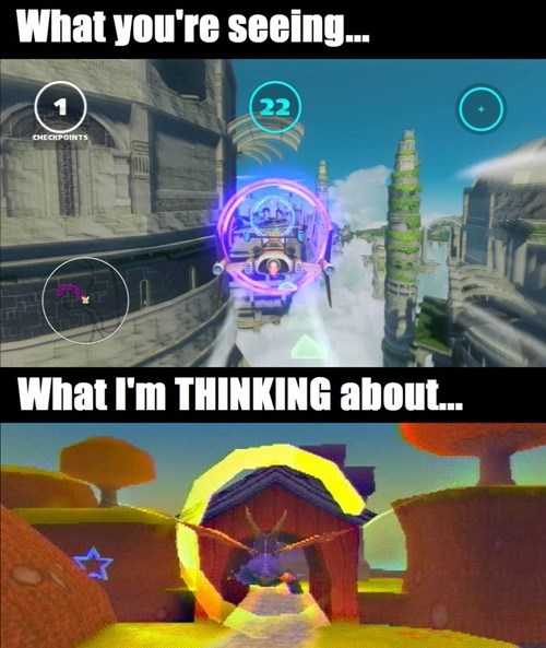 Seriously, I was playing that Ring Race mode in Sonic & All Stars Racing Transformed, and thought, "Why the heck does this feel so familiar?" So yeah, I naturally thought of Spyro, because I'm still a classy guy who wants a new Spyro game... BADLY.