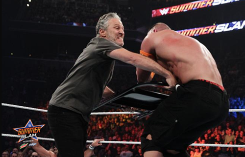 Jon Stewart just turned heel at SummerSlam, taking out John Cena w chair. pic.twitter.com/KaRG8qa7v9