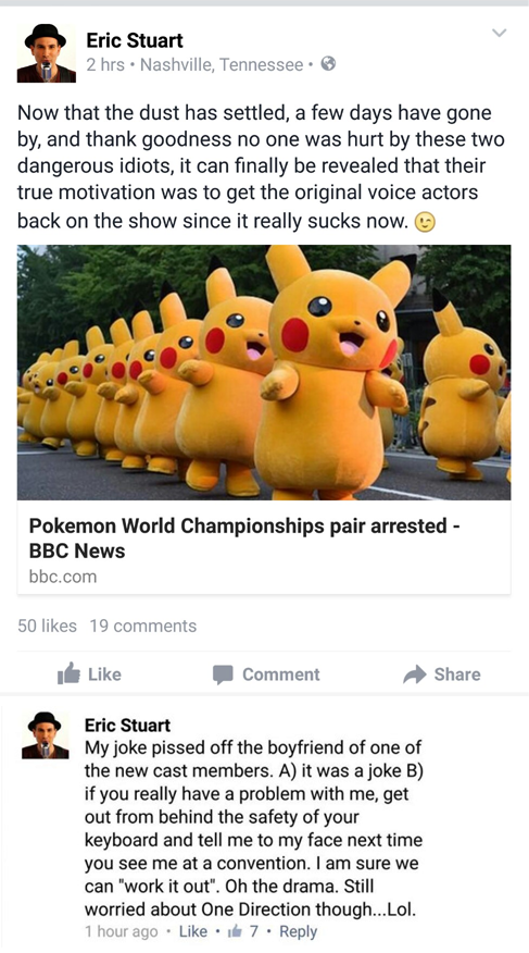Now, I'm not 100% against joking about the situation since it all ended safely, but Eric Stuart is pretty much behaving like an egocentric child... Any thoughts?