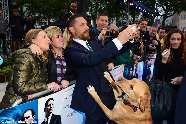 After arriving on the red carpet at London's Leicester Square for the premiere of his film Legend, Tom showed off his best bud—an adorable mutt named Woody.