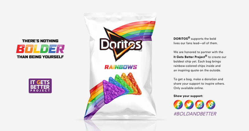 The new product is available exclusively to consumers who donate $10 or more in support to the It Gets Better Project through www.ItGetsBetter.org/DoritosRainbows. Those supporters will be mailed a bag of Doritos Rainbows chips while supplies last.