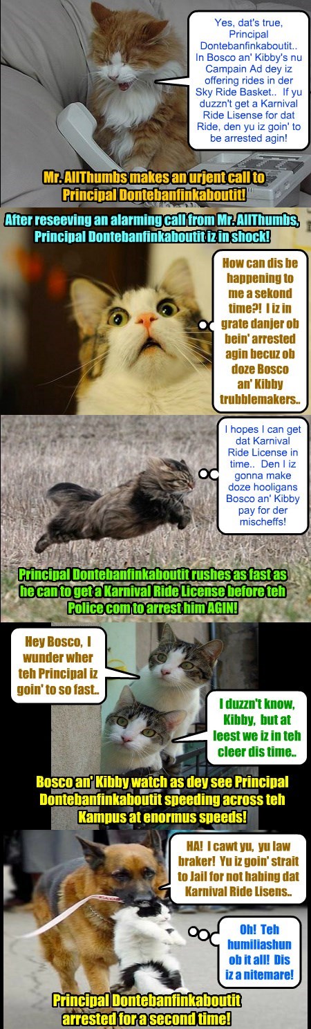 KKPS Fall 2015: After Bosco an' Kibby's latest Campaign Ad made its appearanse wher dey offer free rides in der Sky Ride Basket for Skolars dat vote for dem, Principal Dontebanfinkaboutit iz agin in legal jepardy an' teh target ob Police actions!
