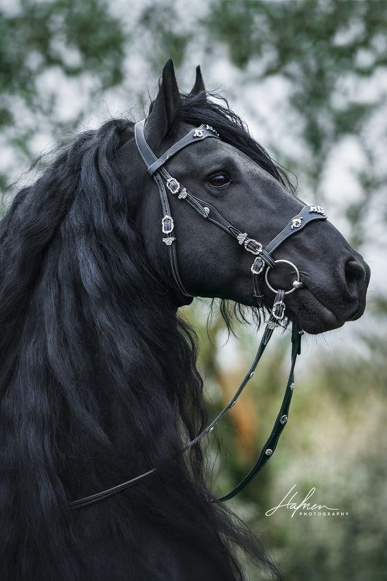 black friesian horse with a long flowing mane TOMSPIC