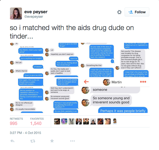 Hook Up of the Day: Girl Matches with That Dude Who Upped the Price on the Life-Saving AIDS Drug by 5000 Percent