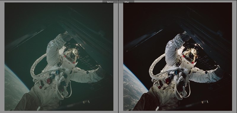 I took the liberty to color correct a few. Note, i've never been to space, so I don't know exactly how things look like out there. These are corrected purely on aesthetics.