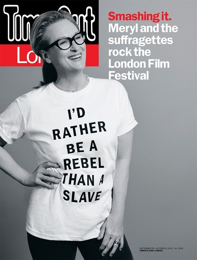 The Sept. 29 issue of Time Out London features Streep and her co-stars wearing T-shirts emblazoned with Pankhurst's famous quote, "I'd rather be a rebel than a slave." While Carey Mulligan, Romola Garai and Anne-Marie Duff also also appear wearing the shirt, Streep — who appears alone on the cover and rejected the term "feminism" in favor of "humanism" in the accompanying Time Out interview — is facing the bulk of criticism.