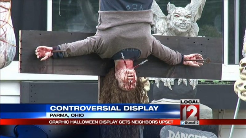 This ghoulish family is causing quite a stir in their town with some very realistic Halloween yard decorations, including: an upside-down cross with cadaver, a mummified corpse hanging from a tree and a dead person on a spike.